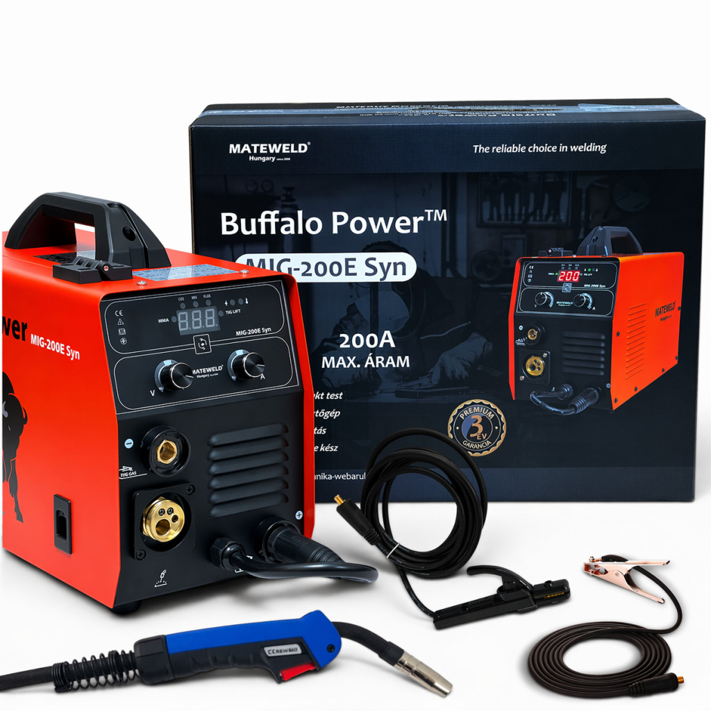 A MATEWELD Hungary Buffalo Power™ MIG-200E Syn a barkács termékpalettánk egyik legnagyobb tudású, mégis felhasználóbarát MIG hegesztőgépe, amely a kisebb MIG modellek összes előnyét megtartja, de jelentősen nagyobb teljesítménnyel, masszívabb felépítéssel és kiterjedtebb funkciókkal rendelkezik. A készülék nagyobb áramerőssége és a nagyobb huzaldob befogadása lehetővé teszi, hogy hosszabb otthoni vagy kisebb karbantartó munkák során is folyamatosan, megszakítás nélkül dolgozhassunk, így ideális választás hosszabb hegesztési feladatokra, ahol a kisebb gépek gyorsan fáradnának vagy túlmelegednének. Az erősebb munkakábelek garantálják a stabil ívtartást és a hosszú távú megbízhatóságot, még intenzív használat mellett is.
