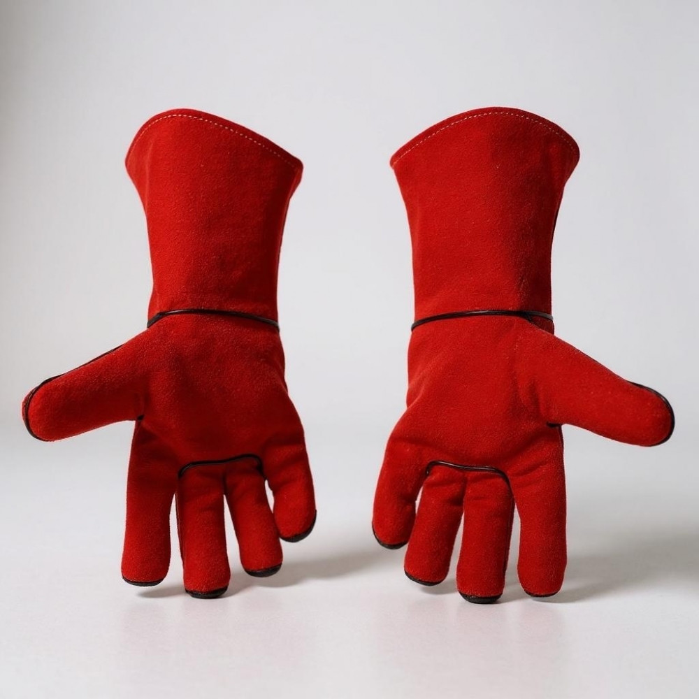 Mănuși de sudură din piele de vită cusute cu fire impregnate ignifuge, cu căptușeală izolatoare din bumbac.